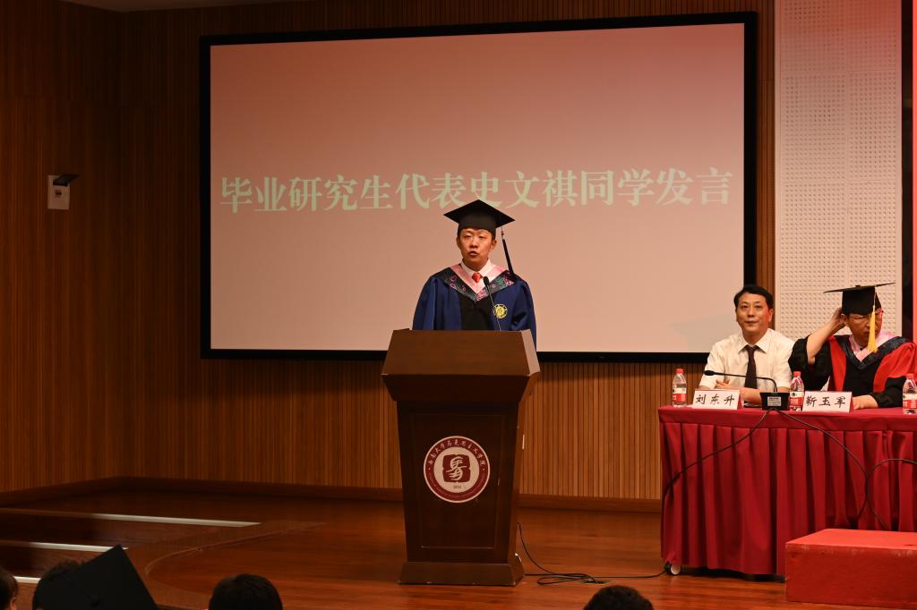 研究生毕业生代表史文祺用“师恩难忘、友谊难忘、学院难忘”,感谢守护自己成长的恩师;感谢同舟共济、互相进步的同窗;感谢为成长发展撑起一片晴空的学院。