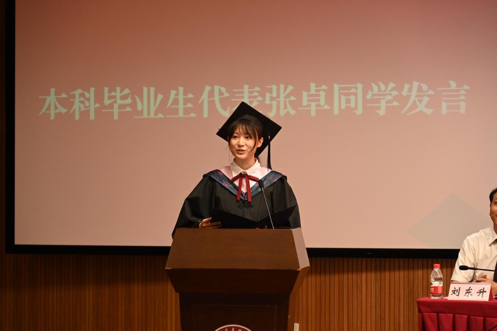 本科毕业生代表张卓同学回忆了自己在学院成长奋斗的点滴,向学院、向辛勤培育自己的老师表达衷心感谢,并表示将秉承学院精神,一往无前向未来。