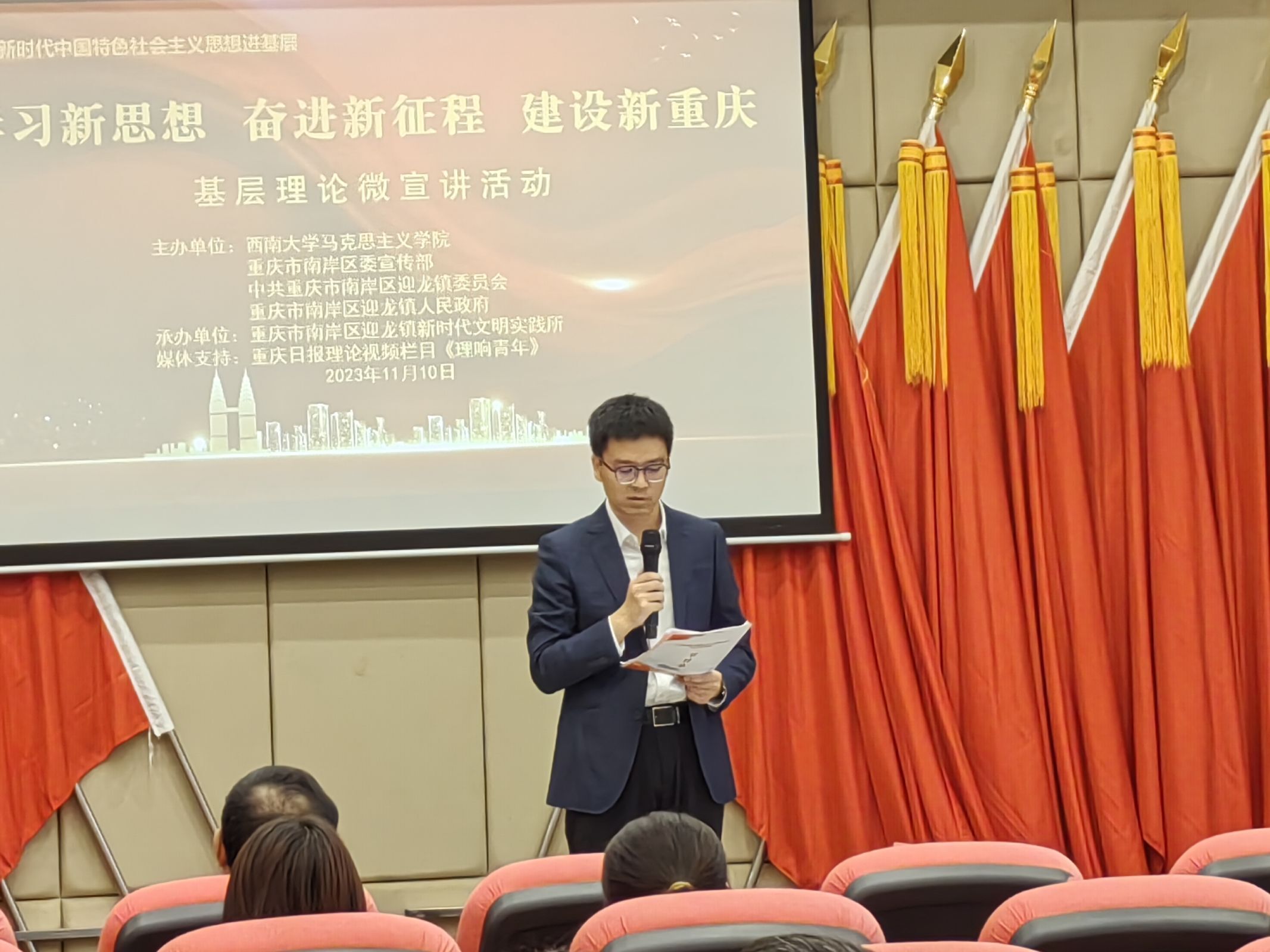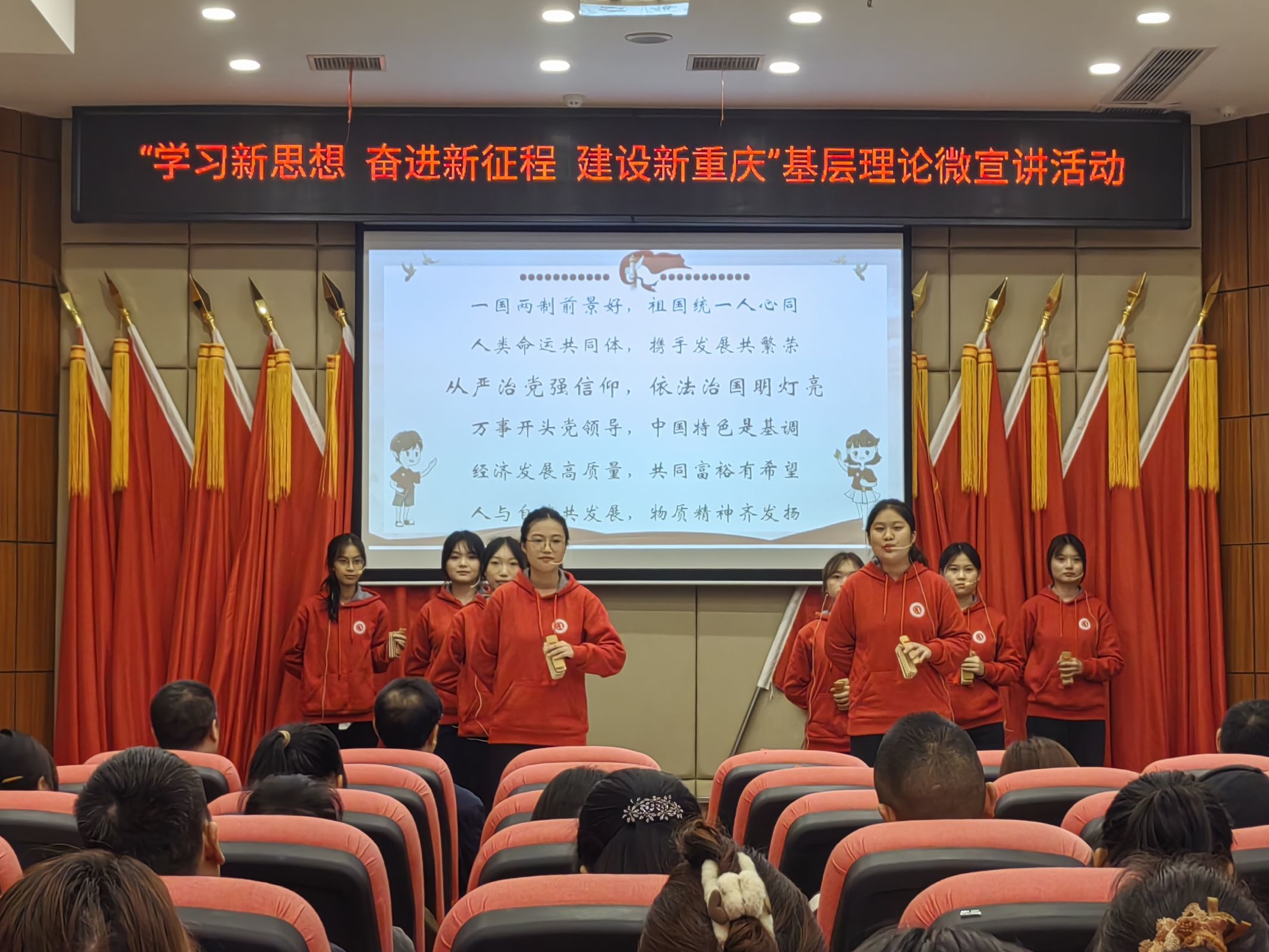 时代号角催奋进,结对共建谱新篇。bv伟德国际1946与南岸区迎龙镇党委政府本着“共建、共创、共享、共赢”的原则,搭建宣传思想文化实践基地,构建基层理论宣讲新阵地,促进马克思主义中国化时代化在基层落地开花。本次理论微宣讲活动促进了不同理论宣传团队的交流,以群众喜闻乐见的文艺表演服务,拉近了双方团队成员距离,丰富了乡村实践活动内容,聚力谱写新时代新征程新重庆的新篇章。