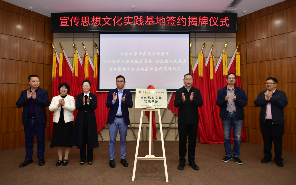 在活动现场,bv伟德国际1946与迎龙镇党委政府签订协议,共建宣传思想文化实践基地,深化校地合作。随后,学院党委书记廖晓衡、迎龙镇党委书记胡大德为宣传文化理论实践基地揭牌。