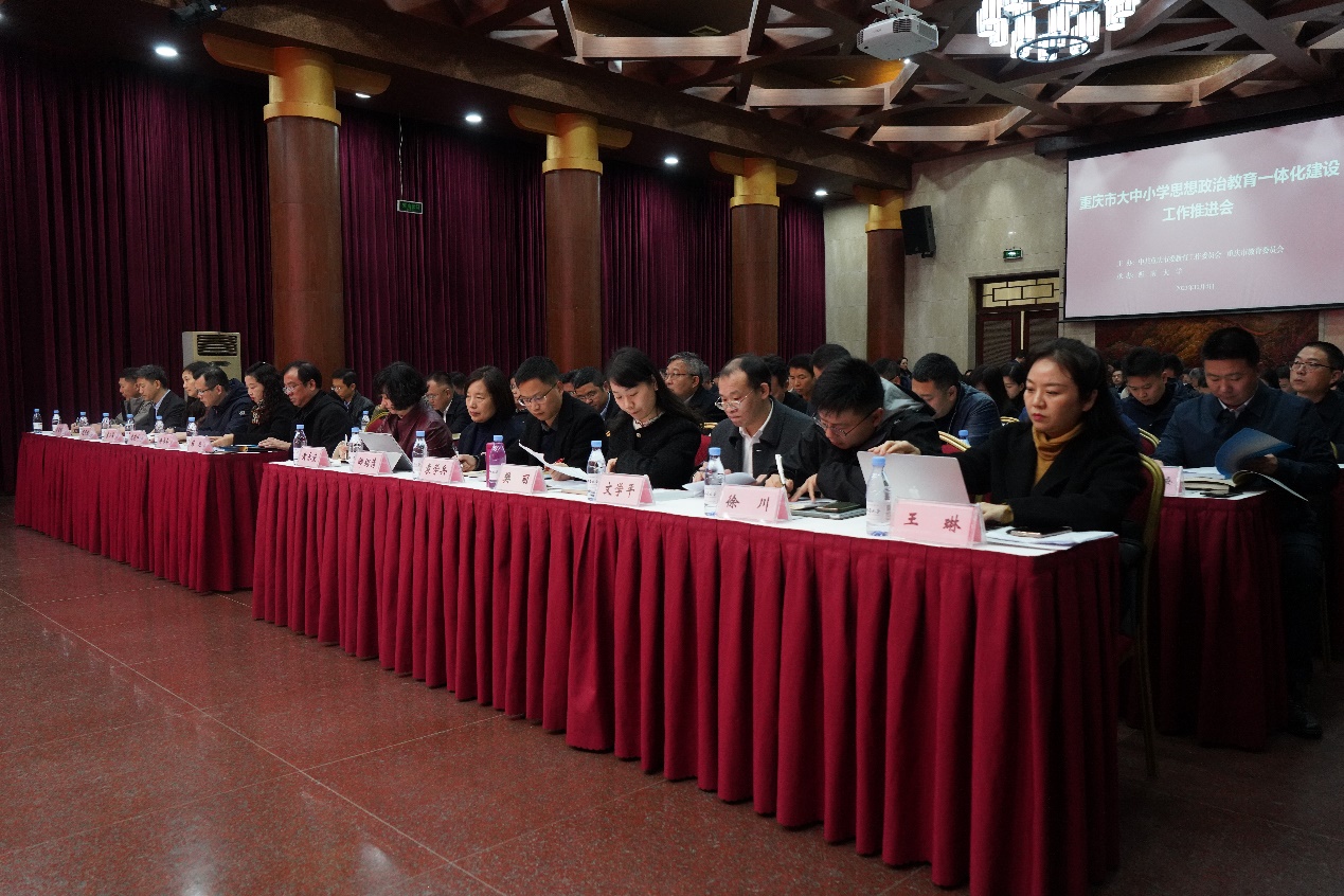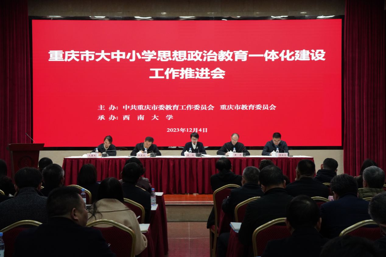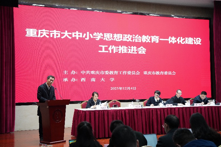 为深入学习贯彻习近平新时代中国特色社会主义思想和党的二十大精神,贯彻落实全国大中小学思想政治教育一体化战略研讨会精神,推进大中小学思想政治教育一体化建设,2023年12月4日,由中共重庆市委教育工作委员会、重庆市教育委员会主办,伟德victor1946承办的重庆市大中小学思想政治教育一体化建设工作推进会顺利召开。市委教育工委专职副书记屈锐出席会议并讲话。我校是教育部大中小学思政课一体化建设共同体重庆市的牵头单位,学校党委副书记黄杰出席会议并致辞。会议由重庆市教委宣教处处长李林齐主持。