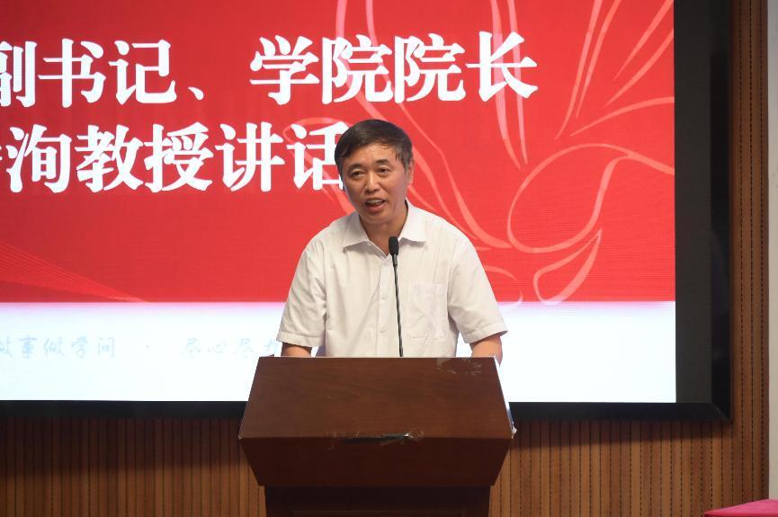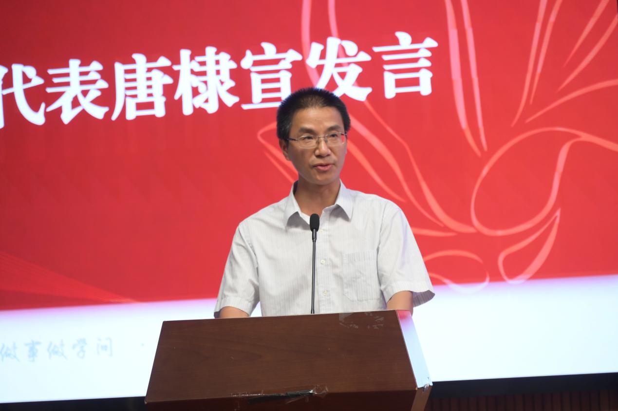 教师代表唐棣宣教授发言,他围绕“祝贺”“幸运”“奋斗”三个关键词,亲切地向新生提出“既要仰望星空、志存高远,又要脚踏实地、埋头苦干”“既要心怀感恩、心存敬畏,又要坚守底线,不越红线、不碰高压线”“既要学会学习、乐于学习,又要懂得生活、勤于实践”“既要善于独处、独立思考,又要注重交流、加强合作”四点殷切建议。