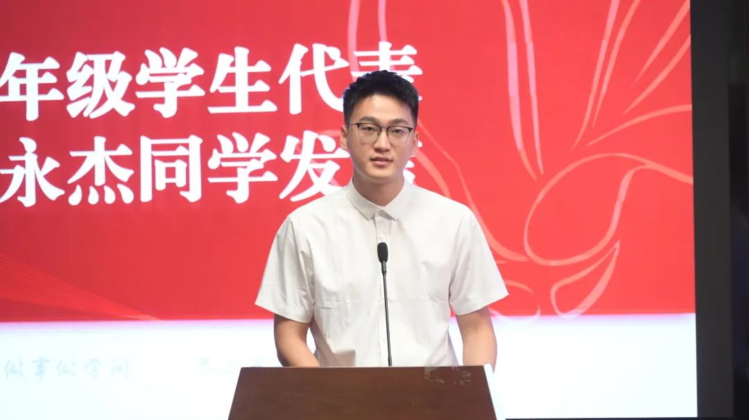 2022级硕士生代表谢永杰以“做自己的‘悟空’”为题,结合自身成长经历,用“与时代同行”“有目标、敢追求”“高度自觉、高度自律”三个方面与同学们共勉,发出“无奋斗不青春”的响亮号召。