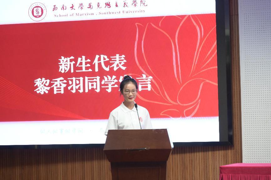 2024级本科新生代表黎香羽发言,从院训之“做人”“做事”“做学问”的三个层面与同学们共勉,作出了“不负璀璨青春,不枉似锦年华”的庄严承诺。