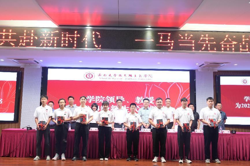 学院领导、教授为2024级新生代表赠书,研究生代表和本科生代表依次上台领取赠书。学院为每位本科生准备了《共产党宣言》,为研究生准备的是一套《马克思恩格斯选集》(全4卷),一本本“经典著作”承载的是学院希望同学们把读原著、学原文、悟原理当做一种生活习惯、一种精神追求的殷殷期盼。