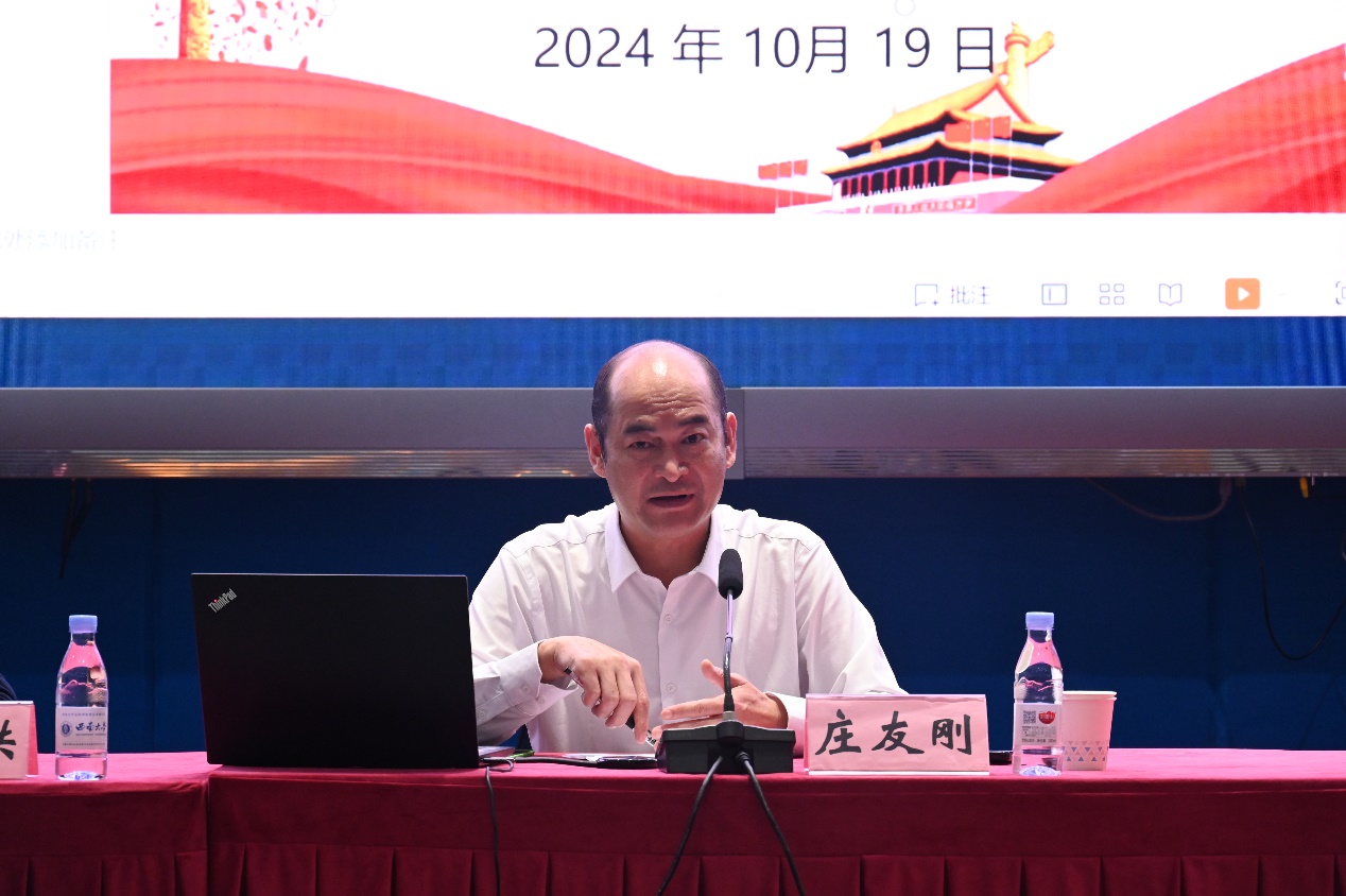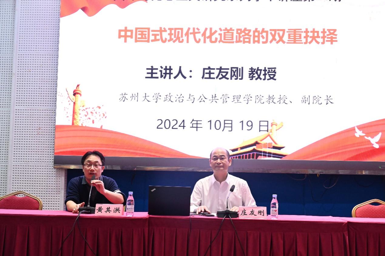 据悉,2024年10月19日晚上8点,中国辩证唯物主义研究会城市哲学分会会长、苏州大学政治与公共管理学院副院长庄友刚教授应邀到bv伟德国际1946作学术讲座,讲座的主题为“中国式现代化道路的双重抉择”。该讲座是伟德victor1946国外马克思主义研究系列学术讲座的第24期,本次讲座由伟德victor1946西方马克思主义研究所承办,由西方马克思主义研究所所长黄其洪教授主持,伟德victor1946国外马克思主义研究、马克思主义基本原理和马克思主义发展史专业的博士生、硕士生以及本科生共70余人参加了本次讲座。