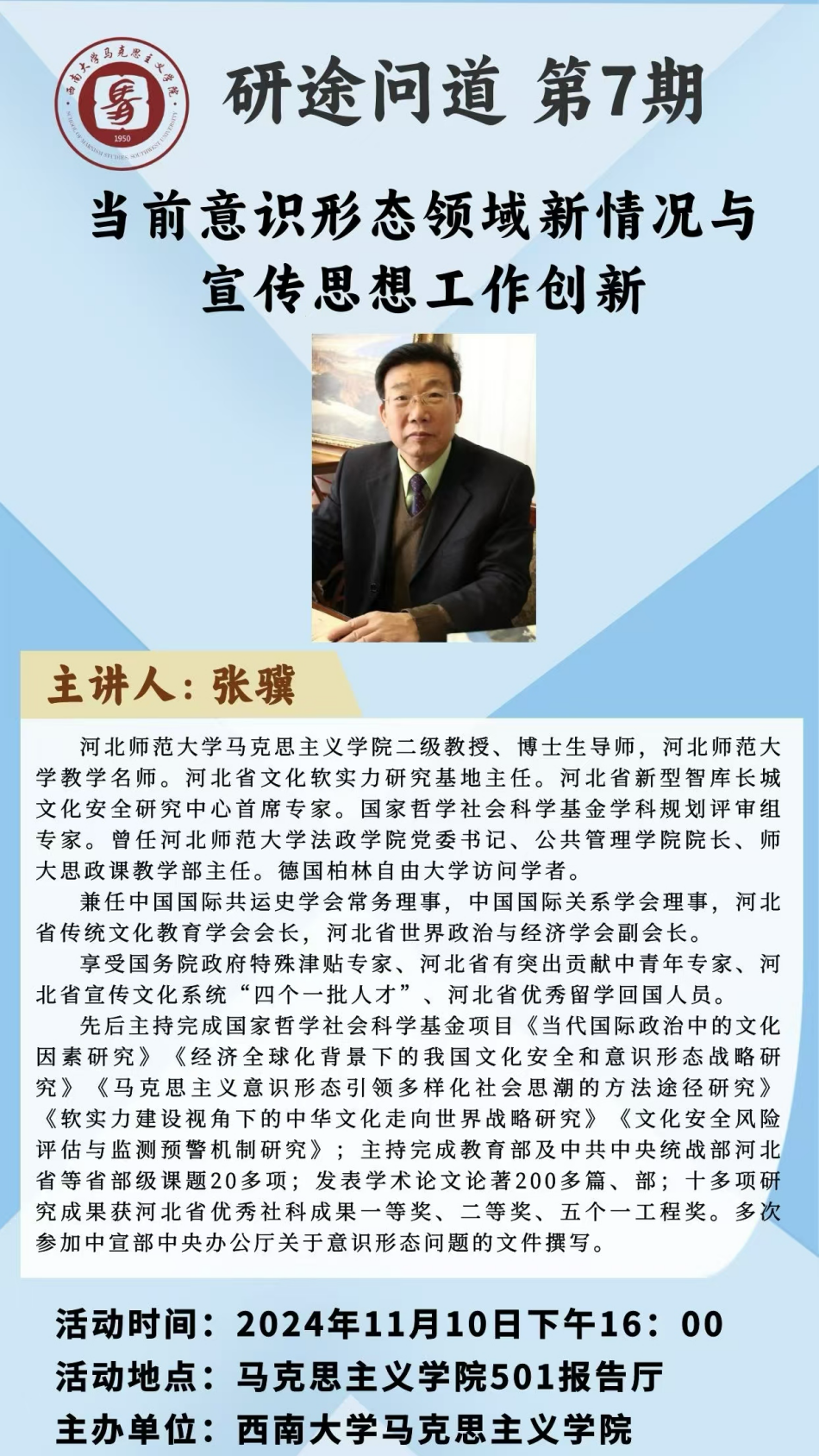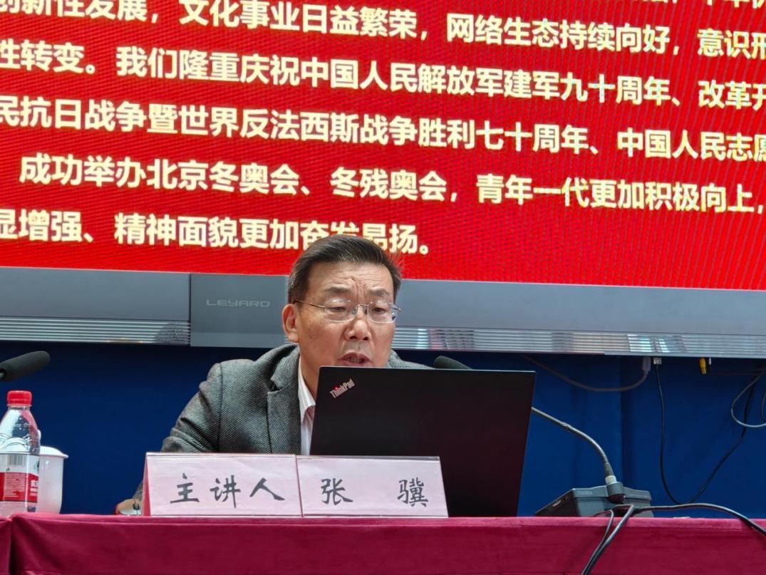 为帮助bv伟德国际1946研究生深入了解意识形态领域的前沿动态,提高学术与科研能力,11月10日下午,bv伟德国际1946在501报告厅开展了第七期“研途问道”活动。本次讲座邀请到了河北师范大学教育名师张骥教授做“当前意识形态领域新情况与宣传思想工作创新”为主题的学术分享。活动由bv伟德国际1946副院长靳玉军主持。