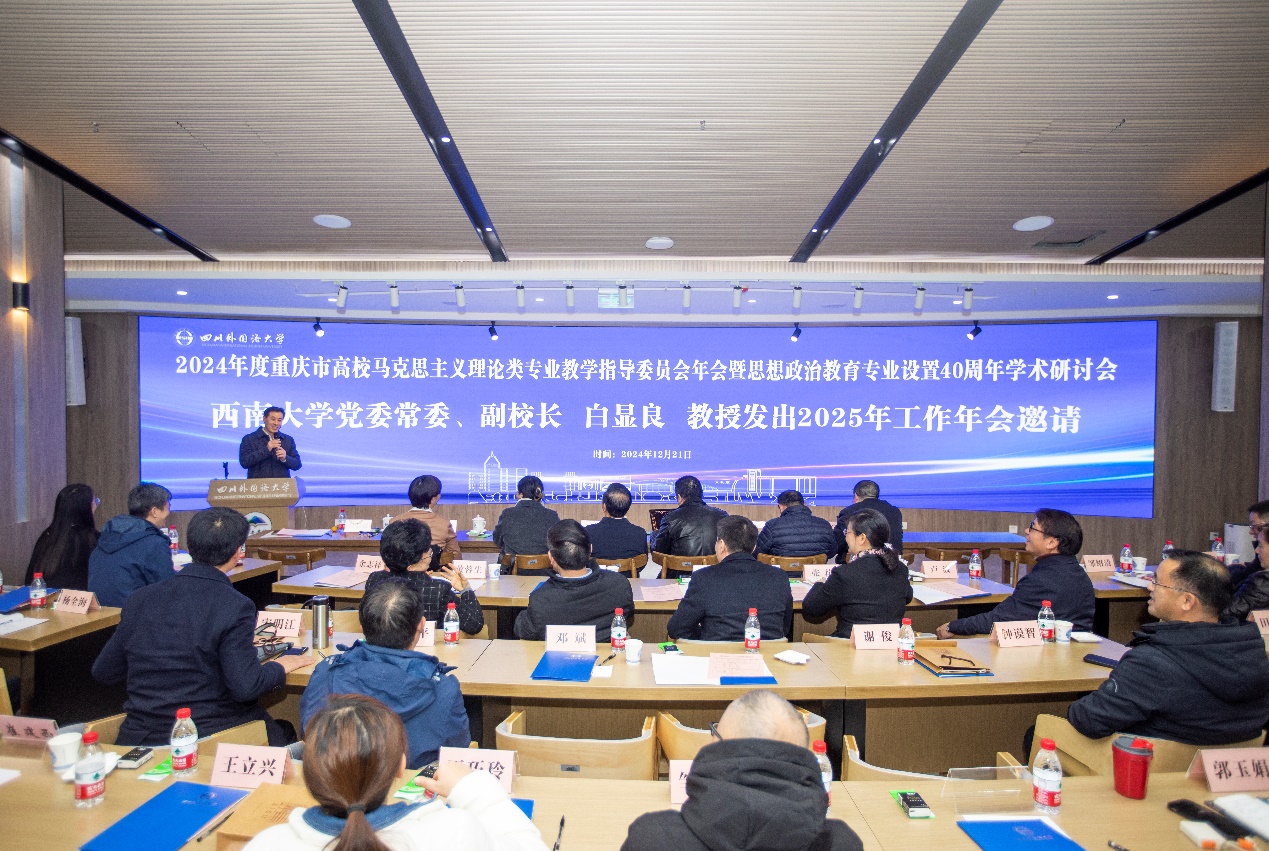 近日,2024年度重庆市高校马克思主义理论类教学指导委员会年会暨思想政治教育专业设置40周年学术研讨会在四川外国语大学歌乐书院召开。重庆市教委高教处调研员李翔、重庆市高教学会秘书长余志祥到会指导。