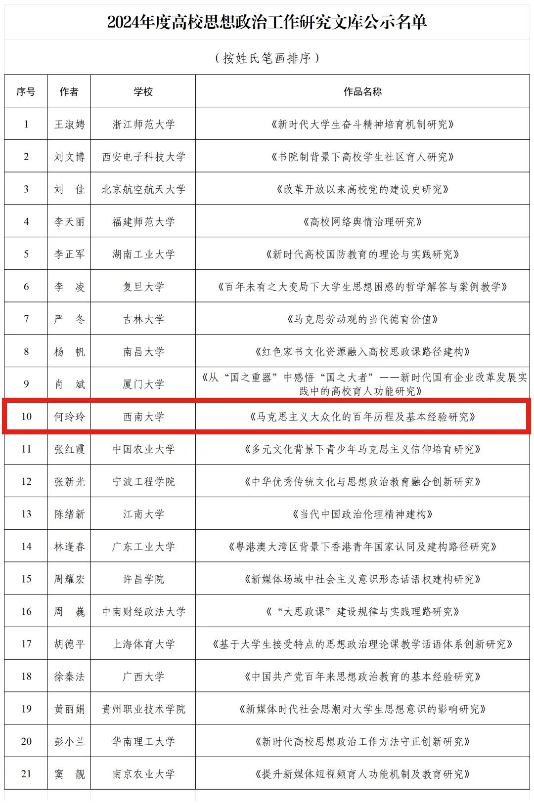 三是抓思政聚合力。扎实推进“红岩精神铸魂时代新人”,获批全国辅导员名师工作室,入选高校思政工作研究文库、教育部红色文化弘扬基地。承办共产党人家风档案展。建立健全教师思想政治和师德师风建设工作组,拟定年度工作计划,常态化开展思政课教师实践研修,师德师风警示教育,严把教师思政和师德师风考核关。提升党建带团建群建效能,学院党委定期研究共青团工作,工会、教代会工作和统战工作,组织召开学代会,组织开展青年教师座谈会、荣休仪式等关注教师发展,重阳节慰问关爱离退休教师,营造关爱师生的良好氛围。