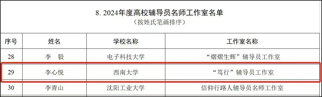 2024年度学院辅导员队伍建设也取得重大突破。辅导员李心悦主持“笃行”全国辅导员名师工作室,获伟德victor1946第二届“张永青李兰党建与思想政治工作奖”,并荣获全国教育系统先进工作者称号,赴京参加教育部表彰大会,受到习近平总书记的亲切接见。学院辅导员1人次荣获重庆市优秀思想政治工作者,获批重庆市教委思政项目1项,重庆市社科规划中特重点项目1项。