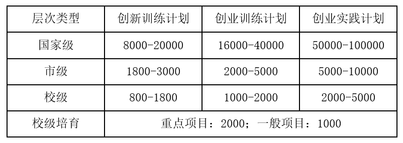 大学生创新创业训练计划项目经费资助标准(单位:元)