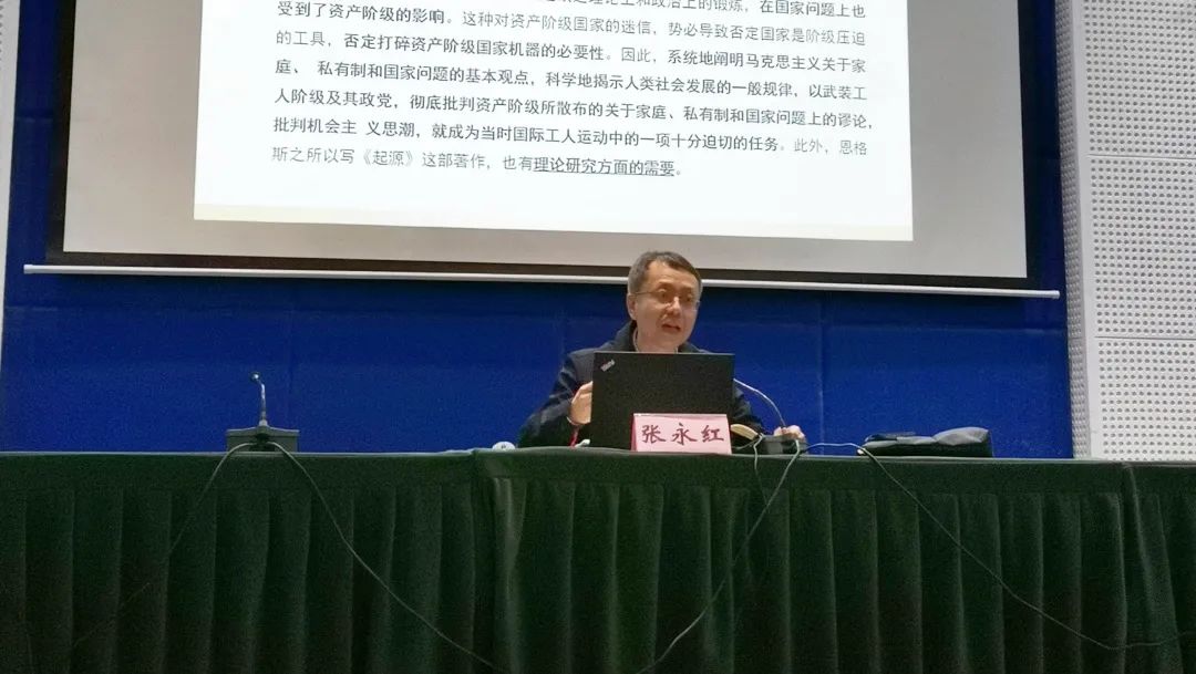 首先,张永红教授对这篇著作进行了总揽式的介绍。随后,他介绍了恩格斯《家庭、私有制和国家的起源》的写作背景和主要内容,由浅入深地为同学们进行了解读。他从恩格斯写作的三个目的讲述了该书的写作背景:一是为了以系统的马克思主义理论,以马克思主义对历史和现实的重大问题的正确认识来武装工人阶级及其政党;二是为了批判资产阶级的谬论;三是为了用马克思主义观点总结最新的科学成就。最后,张永红教授介绍了《家庭、私有制和国家的起源》这篇经典文献的结构,并结合经典著作原文,向同学们详细讲解了其中的主要内容和观点。他指出,文章主要包含两版序言和四个部分,即蒙昧时代与野蛮时代、家庭形式的演变、社会组织形式的转变以及经济条件从野蛮时代到文明时代的变化。