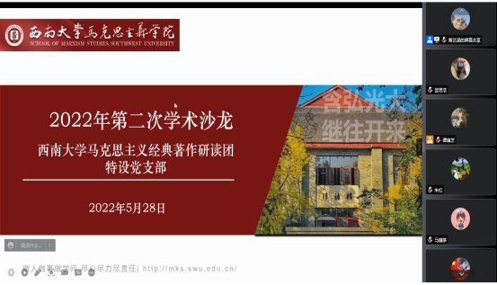 5月28日下午,伟德victor1946马克思主义经典著作研读团、特设党支部2022年第二次学术沙龙通过线上形式召开。本期学术沙龙由研读团成员蒋艺涵同学主持,研读团全体成员参加了本次活动。