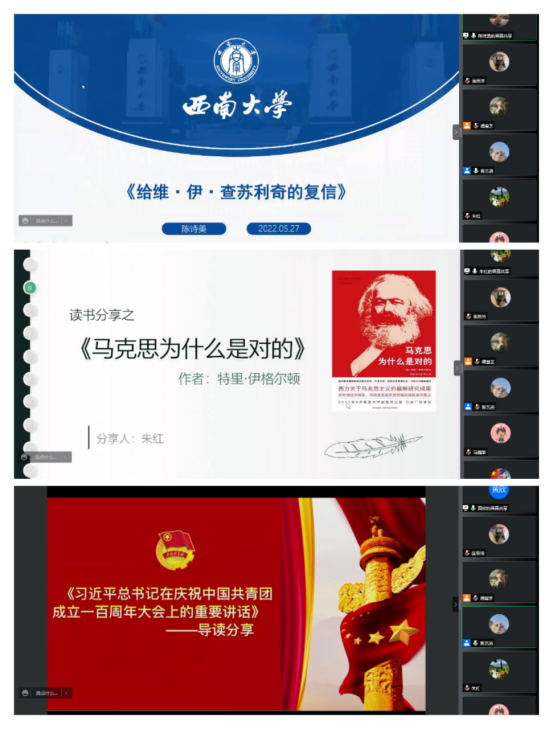 研读团成员黄欣、朱红和陈诗美作分享汇报。黄欣同学从回顾共青团百年历程、总结共青团历史经验、新时代下对共青团提出的新要求以及当代青年唱响青春之歌等方面对习近平总书记在共青团成立一百周年大会上的重要讲话内容进行梳理和概括。朱红同学就《马克思为什么是对的》一书作分享汇报,详细介绍了作者伊格尔顿的人生经历,阐释了本书的写作背景、文本逻辑以及驳斥反马克思主义的十大论调并分享了学习心得。陈诗美同学围绕《给维•伊•查苏利奇的复信》的写作背景、主要内容和现实启示等方面进行讲解,重点讲述了“跨越卡夫丁大峡谷”之争。