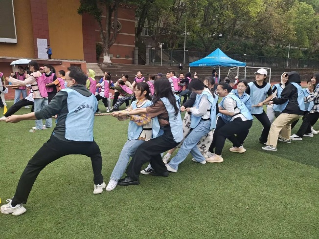首先进行的是“万水千山”。跑道上,各组成员如离弦之箭,手持跳绳冲向目标。接力队员火力全开,迅速完成仰卧起坐!绳影摇曳,勾勒出他们奋斗的姿态,纵使万水千山,依然砥砺向前。随后便进入第二个项目“脚踏实地”。绿茵场上选手们脚系气球,全团出击,灵活化解对手的进攻。他们脚步坚定,团结一致共前进!一声声响亮的气球爆炸声,迅速将全场的气氛推到制高点。脚踏实地,行稳致远,是马院人一贯的做事态度。紧接着,便是“开天辟地”的紧张进行时。俯身、转向、前进,选手们一次次移动泡沫砖,不断逼近终点线。心怀奋斗信念,不惧挑战!前方艰难险阻,亦阻挡不了前进的决心。最后,在嘹亮的呐喊声中,比赛进入最后一个项目“众志成城”。选手紧握麻绳,稳扎马步,在团队的对抗中凝聚一心、众志成城!哨声响起,结果揭晓,他们欢呼雀跃、击掌喝彩,享受拼搏后的喜悦,感受运动的乐趣。