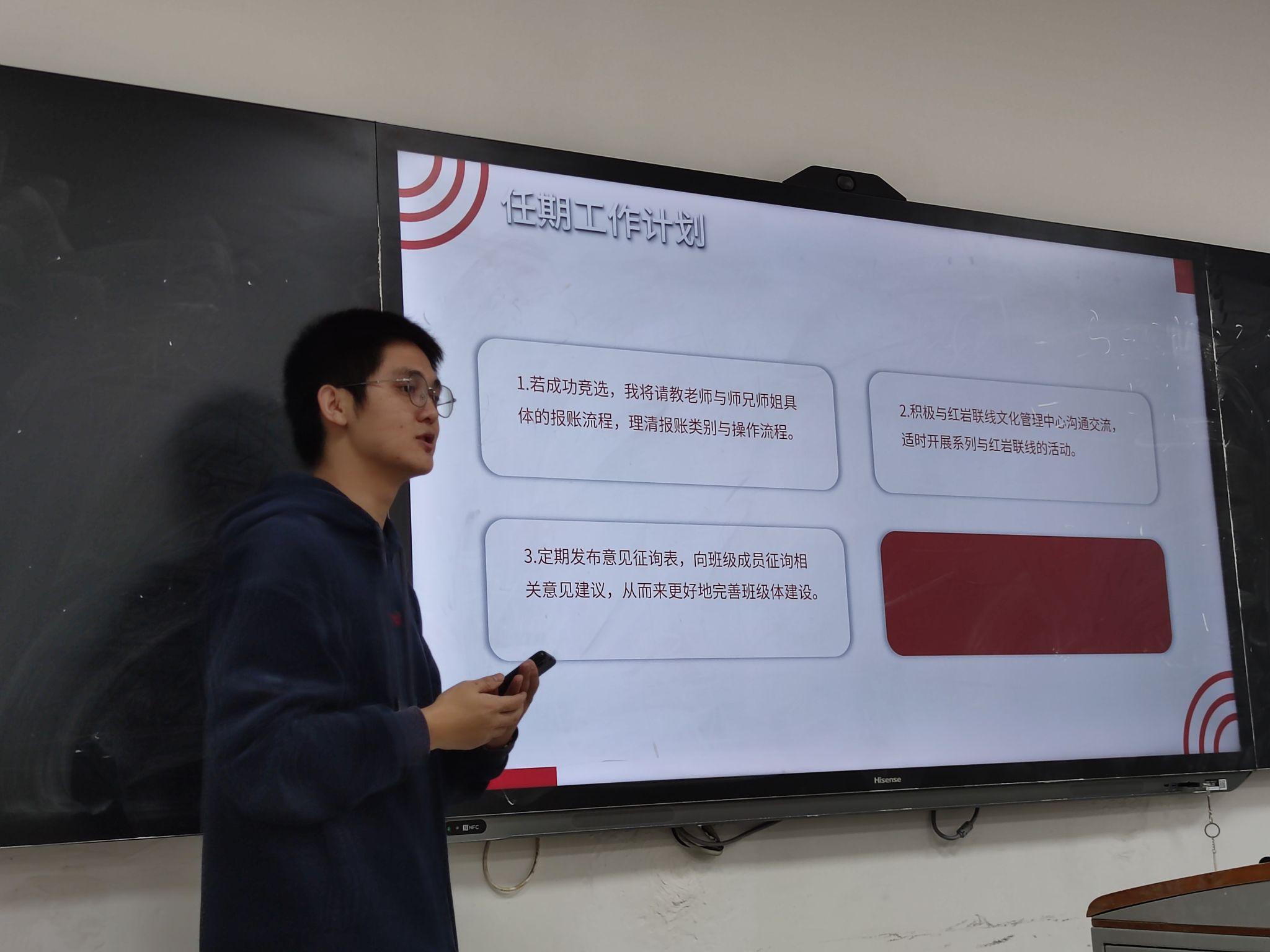 薪火相传,笃定前行。本次班委换届竞选本着自愿报名、公开选举、择优录取的原则,分为竞选演讲和竞选答辩两个流程。首先由周庆庆朗读班委换届竞选顺序。接下来,王思瑶、王博言等同学分别就自我介绍、工作经历、工作认知及未来工作构想四个方面展开不同职位的竞选演讲,并就班级管理与组织认知、未来工作构想细节等方面进行答辩。最后依据得分从高到低,产生“红岩菁英班”第二届班委:王博言担任班长,王思瑶担任团支书,彭国龙担任组织委员,邱思怡担任宣传委员,颜倚彦担任学习委员。
