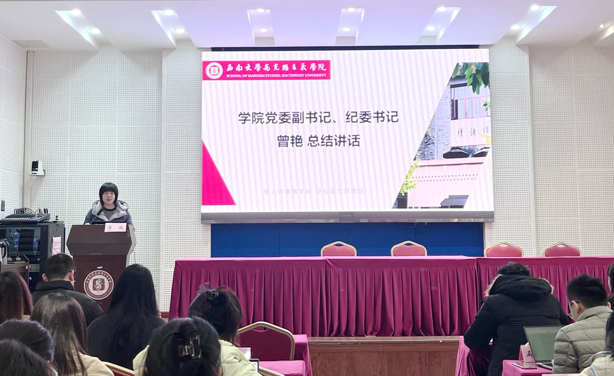 最后,学院党委副书记、纪委书记曾艳为本次会议作总结讲话。她首先对学院研会过去的工作成果表示高度认可,并对研会各位成员的辛勤付出表示衷心感谢。其次,她提出对研会未来工作的期待与想法:一是指明研究生会与团委学生会的关系,认为学生组织都应面向广大学生需求,提供多元服务,各成员要团结协作、充分发挥自身特长;二是强调研究生会既要以学术为中心,也要着力思考如何为提升同学的核心竞争力搭建平台;三是建议进一步把工作建立在调研的基础上,以广大学生的切实需求为出发点,更加关注学院研究生的现实诉求。