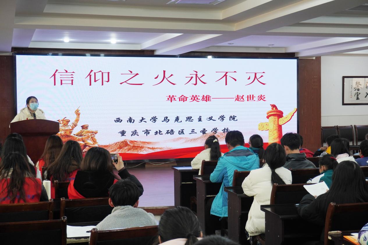 从革命历史中汲取力量,传承红色精神,是每个中华儿女应有责任。本次实践活动立足重庆这座红岩精神发源地,围绕革命英雄赵世炎的生平事迹,以漫画展示与讲故事的形式给三圣学校小学生带来了一堂别开生面的红色教育课堂,使孩子们在课堂中感受革命先烈崇高精神,从革命先辈的故事中汲取前进的力量,让爱党爱国的“红色种子”在心中生根发芽、茁壮成长。