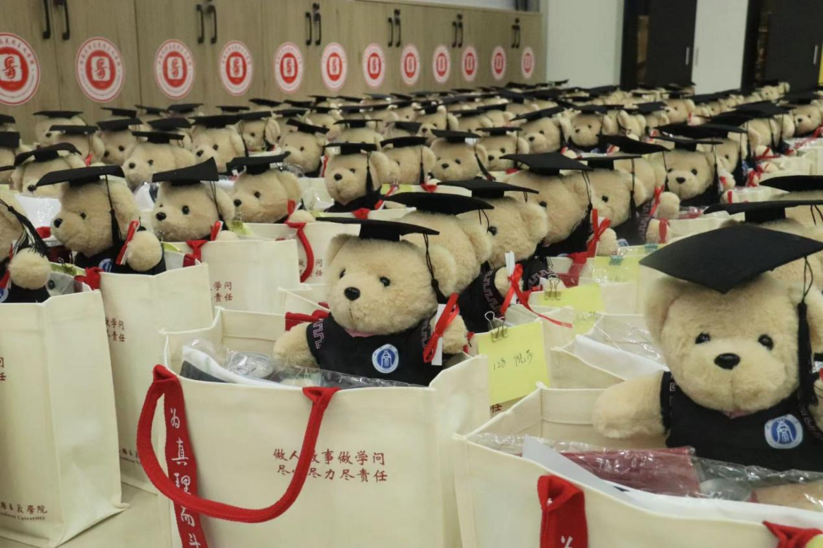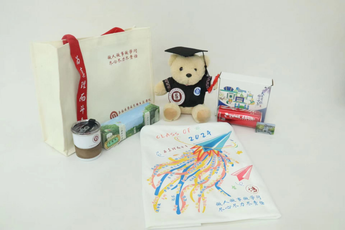 学院为毕业生们精心准备了丰厚的毕业大礼包。每位毕业生都有一件学院特制的纪念版T恤,以及一个可爱温馨的毕业小熊,它们不仅是学院文化的象征,更传递着学院对每位即将离校的学子的不舍与期盼。此外,本科2024届同学们自己还设计了多种富有创意的纪念品:一瓶印有“毕业快乐”和学号姓名的定制版可乐,一套实用美观的冰箱贴,一只颇具学院特色的帆布包和一个精致小巧的水杯。这些纪念品既承载了毕业生们的校园回忆,也代表着学院对他们的诚挚祝福。