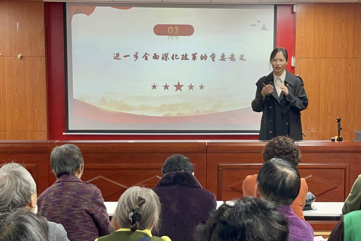 学习全会精神,凝聚精神力量,奋进新征程,展现新作为。此次宣讲以进一步全面深化改革为主线,聚焦社区居民关注的民生问题,将大理论转化为小切口,对进一步全面深化改革的重大意义、重大举措、重要方法等作了系统的宣讲阐释。