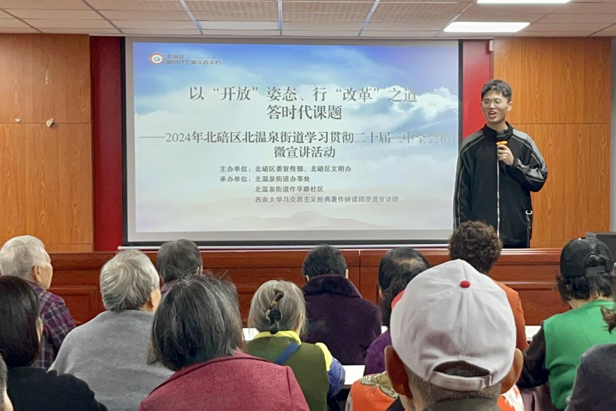 为深入学习贯彻党的二十届三中全会精神,准确把握习近平总书记重要讲话精神实质,着力推动党的二十届三中全会精神落地生根,2024年11月1日下午,伟德victor1946马克思主义经典著作研读团走进北碚区北温泉街道作孚路社区开展了主题为“以‘开放’姿态、行‘改革’之道、答时代课题——深入学习贯彻党的二十届三中全会精神”的宣讲活动。