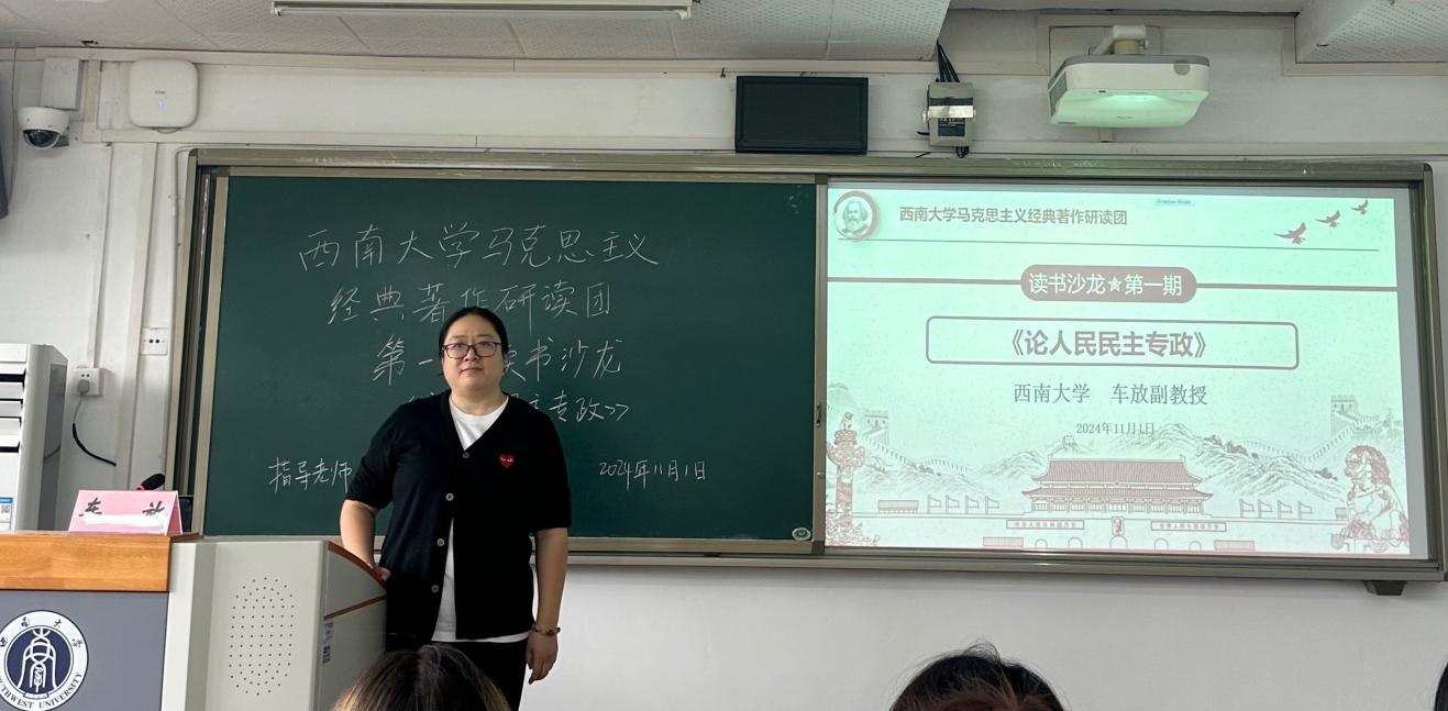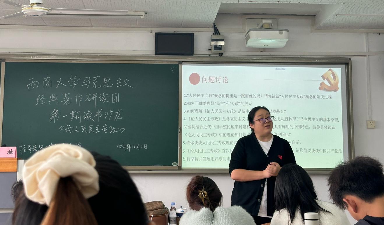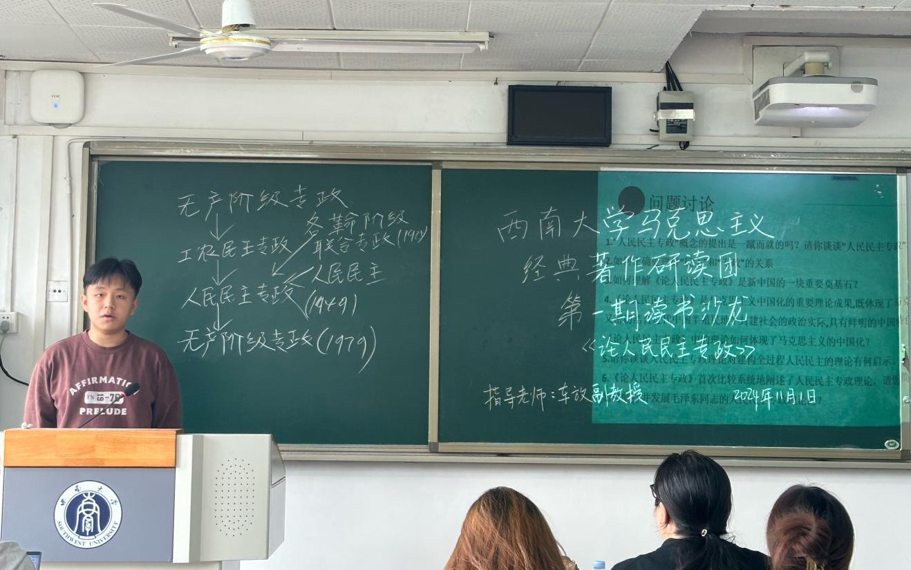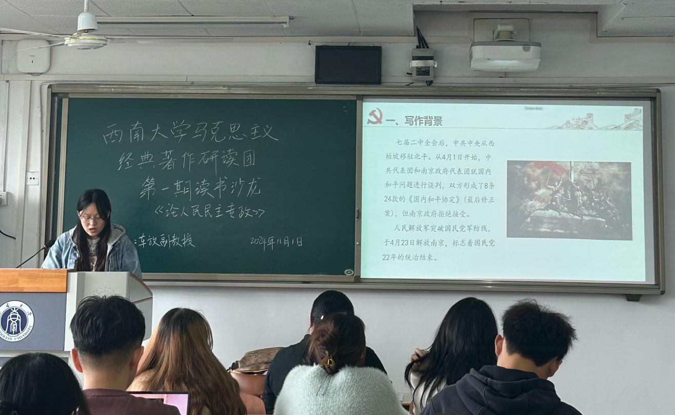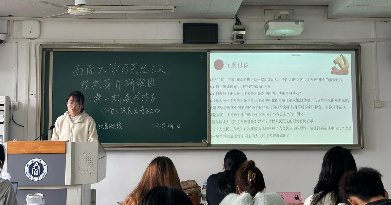 为深入学习马克思主义经典著作,提升我院研究生的学科素养和专业能力,2024年11月1日下午,伟德victor1946马克思主义经典著作研读团在第九教学楼503教室举办了以“读经典、悟原理、联现实——学习《论人民民主专政》”为主题的读书沙龙活动。本次活动邀请到了bv伟德国际1946车放老师指导,bv伟德国际1946经典著作研读团成员及学院部分研究生参与了本次活动。