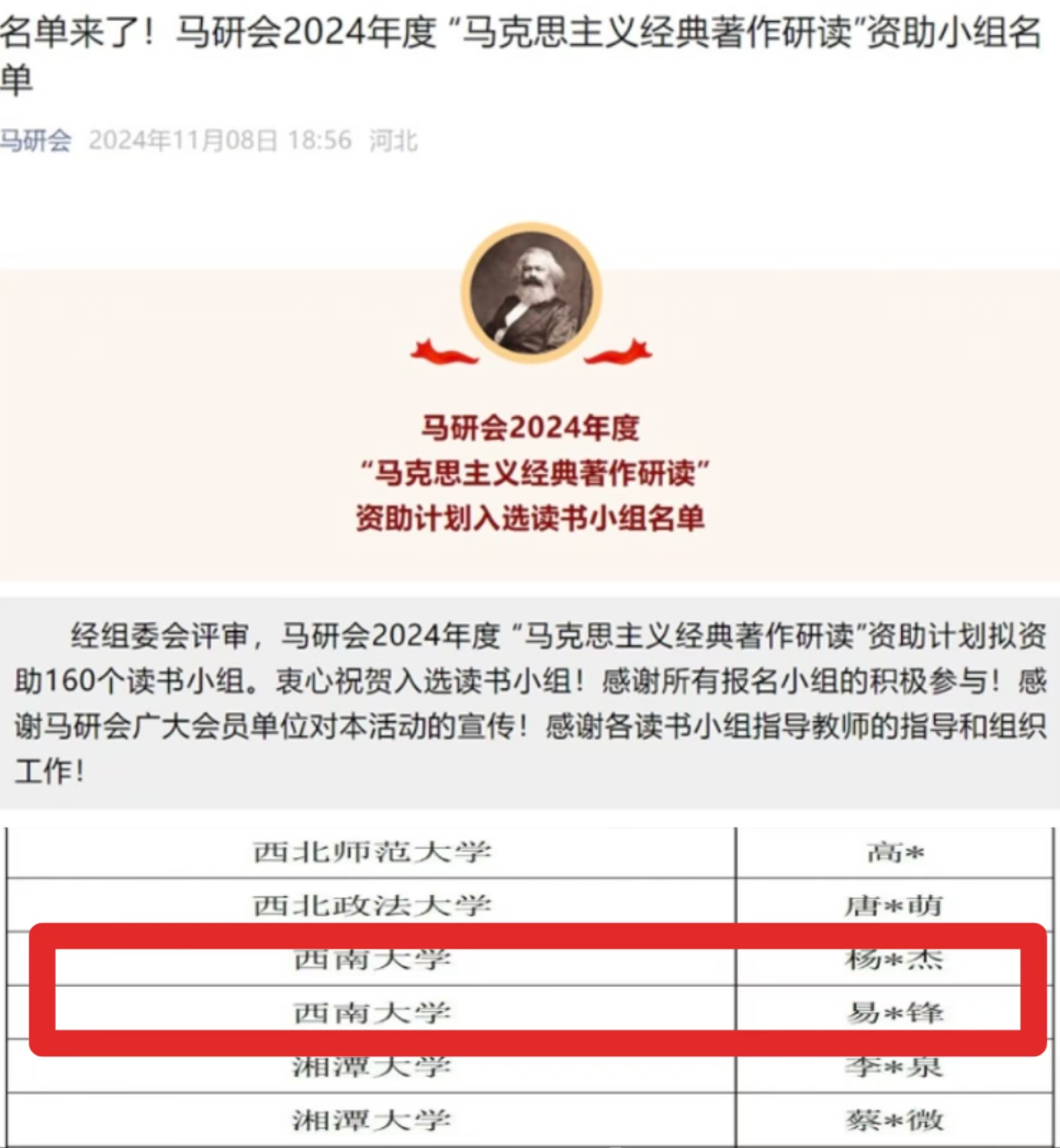 近日,中国高等教育学会马克思主义研究分会2024年度“马克思主义经典著作研读”资助计划名单正式公布,来自全国各高校共计160个读书小组入选。学院组织申报的“绩镛言马”读书小组和“回到列宁”读书小组成功入选。
