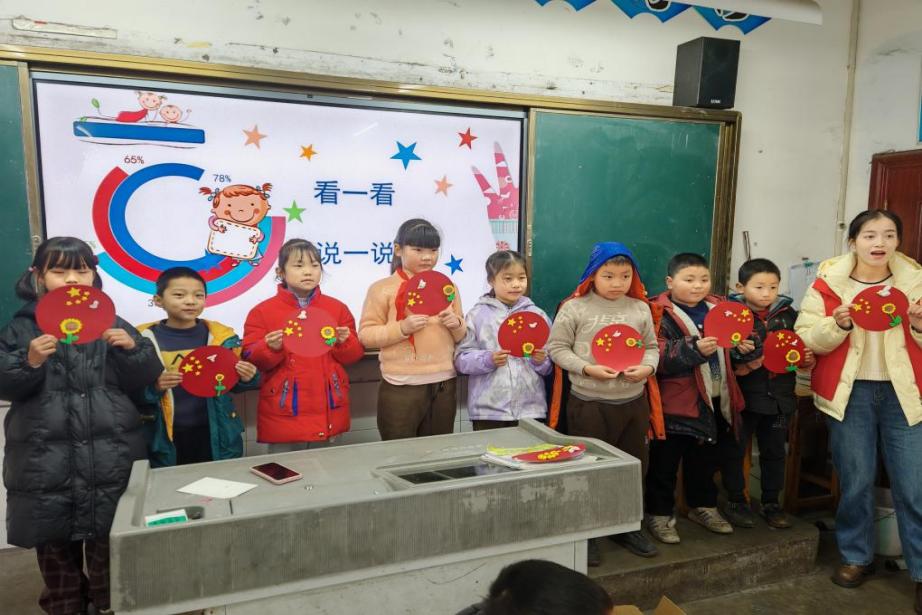 开展实践教育,提升动手能力与解决问题的能力。实践队员为二、三年级的学生们带来了一场别开生面的手工课,他们指导同学们用彩泥制作出国旗和向日葵图案,并组织大家开展了一系列趣味游戏,增进了同学之间的友谊,为课余生活增添了乐趣。