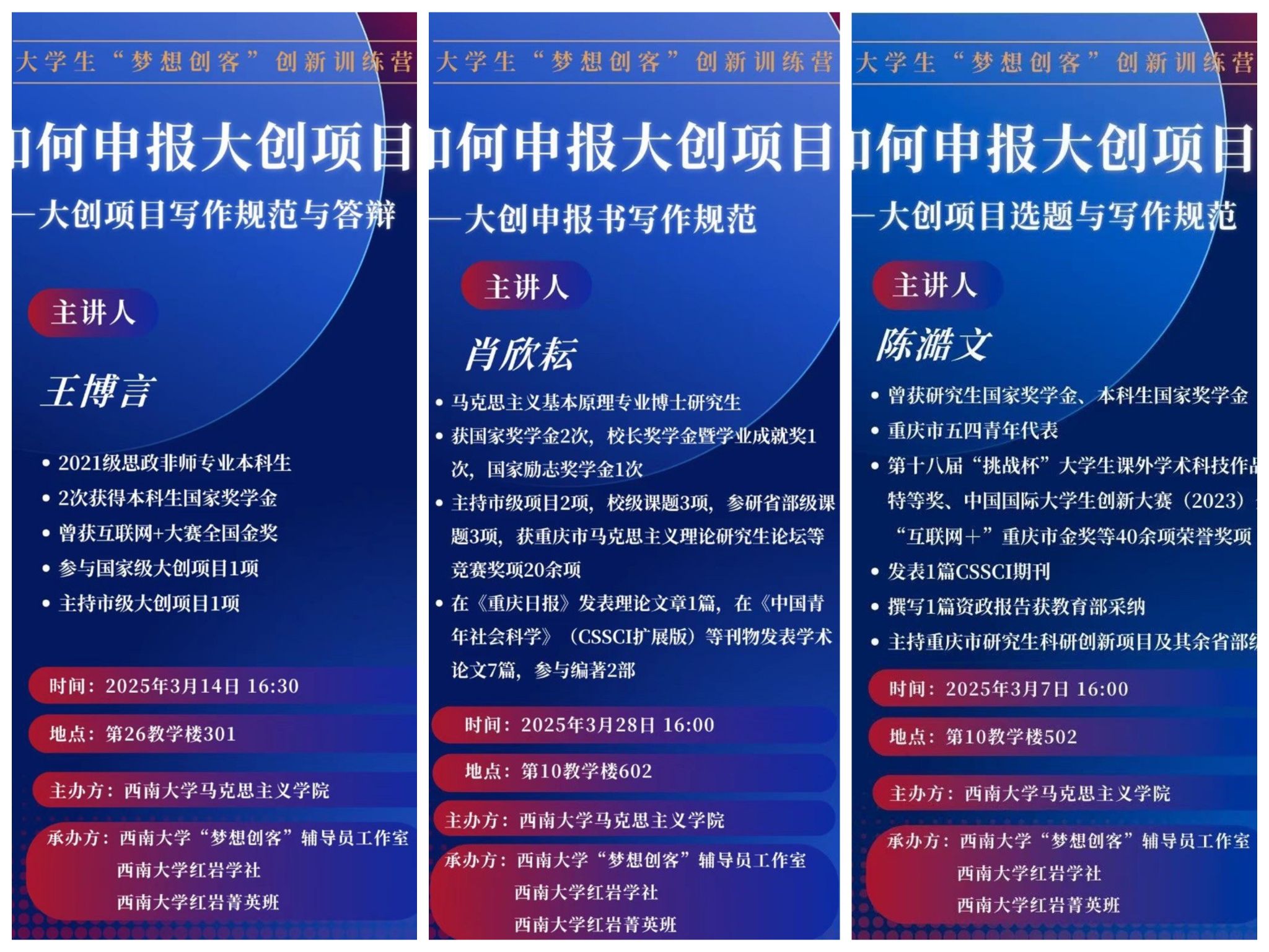 为大力培育学生的科学研究素养与创新实践本领,自3月7日起至3月28日,bv伟德国际1946依托“梦想创客”辅导员工作室、红岩学社以及红岩菁英班,以大创项目申报为契机,精心举办了三场大创项目申报专题培训活动。