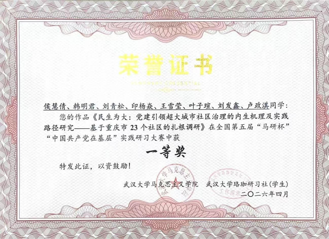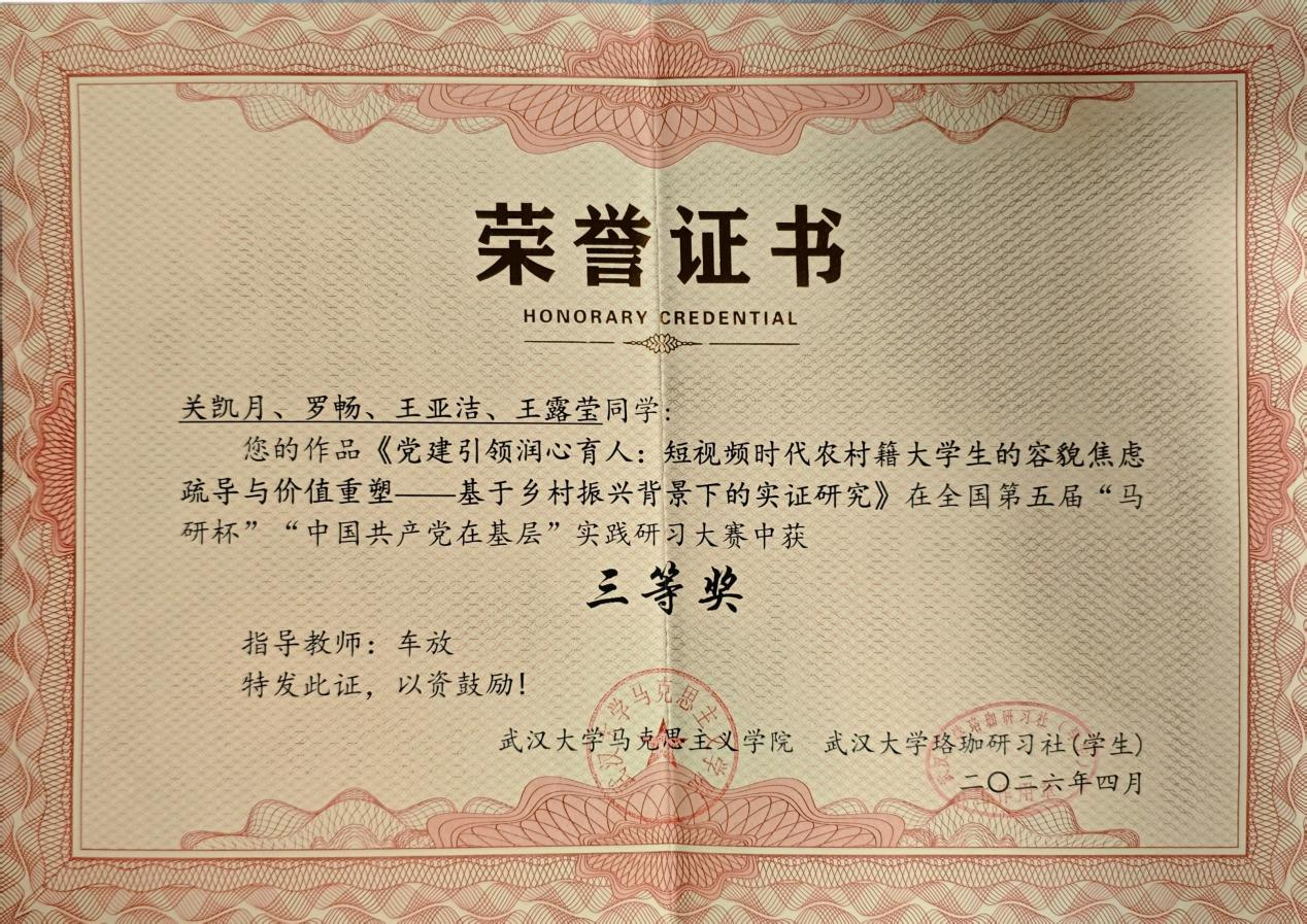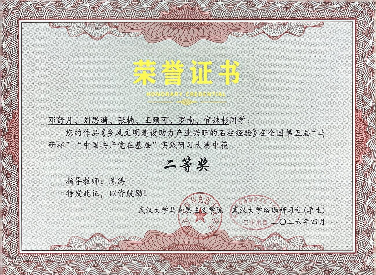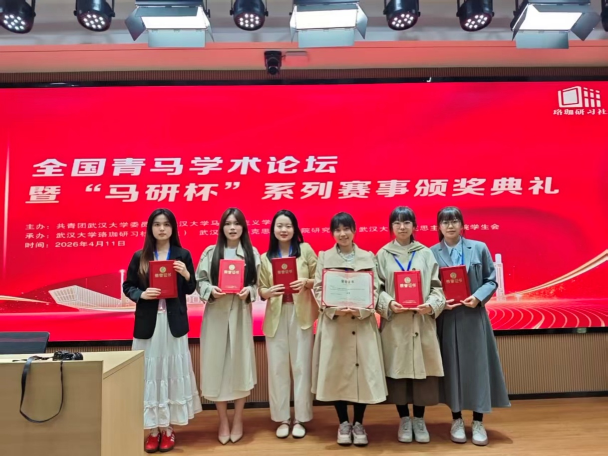 近日,全国青马学术论坛暨“马研杯”系列赛事颁奖典礼在武汉大学顺利举行。我院本科2023级思想政治教育(师范)专业学生叶子瑄、王俞蘅、邓舒月,2023级思想政治教育(非师范)专业学生罗畅、王露莹,2023级马克思主义理论专业学生关凯月,分别荣获大赛全国一等奖两项、全国二等奖两项、全国三等奖两项,受邀参与论坛交流。
