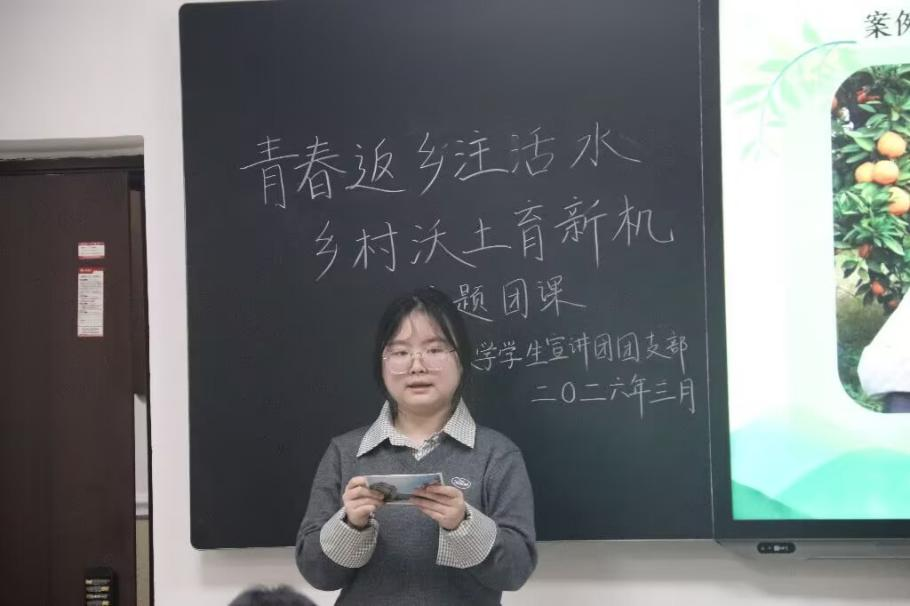 活动伊始,主持人黎响通过2026年全国两会青年代表访谈和乡村发展影像,向团员们展示了返乡青年的心路历程与乡村新貌。随后,黎响带领团员们深入剖析了青年返乡现象背后的时代必然性,使团员们对青年在乡村振兴中发挥的重要作用形成初步认知。