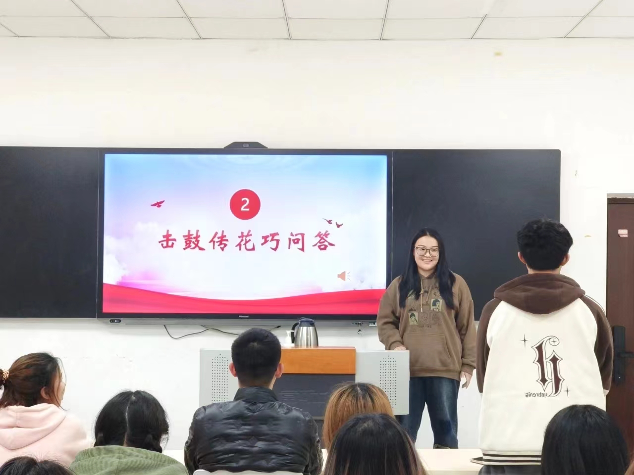击鼓传花,巧妙问答。随着音乐响起,主持人将手中的道具传递给第一位团员,音乐骤停,拿到道具的团员迅速起立,回答主持人抽取的问题。互动过程中,雷锋精神就像一粒种子,在团员们心田中生根发芽,绽放出绚丽的光彩。