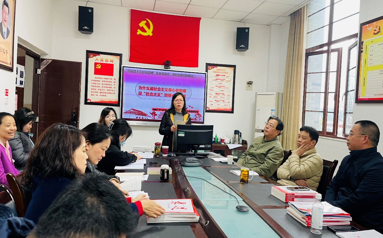 2025年3月14日,“原理”系全体教师在学院213会议室围绕“社会主义核心价值观为什么是‘社会主义’的核心价值”这一主题展开首次教学研讨暨集体备课会。集体备课会围绕既定主题,通过主讲教师分享、全体教师研讨的方式进行。本次集体备课由唐斌、陈子飞、杜丹、邓春芝四位老师主讲。学院副院长唐斌基于既有研究成果结合自己已发表的论文,深入阐释了社会主义核心价值观与社会主义制度、马克思主义理论、中华优秀传统文化、全人类共同价值之间的关系,通过与“普世价值”观的比较,从学理上厘清了社会主义核心价值观的根本性质。陈子飞老师基于社会主义核心价值观的历史发展,杜丹老师基于社会主义核心价值观的国际视野,邓春芝老师就如何融入“马克思主义基本原理”课程教学等方面进行了主题发言。备课会上老师们展开热烈讨论,学校原副校长崔延强老师高度肯定了这种具有问题意识的集体备课形式,他从社会主义核心价值观与全人类共同价值关系的视角进行了解读。胡刘老师从国际共产主义运动的视角、何玲玲老师从中国式现代化共性与个性的视角对这一主题做了进一步的探讨。